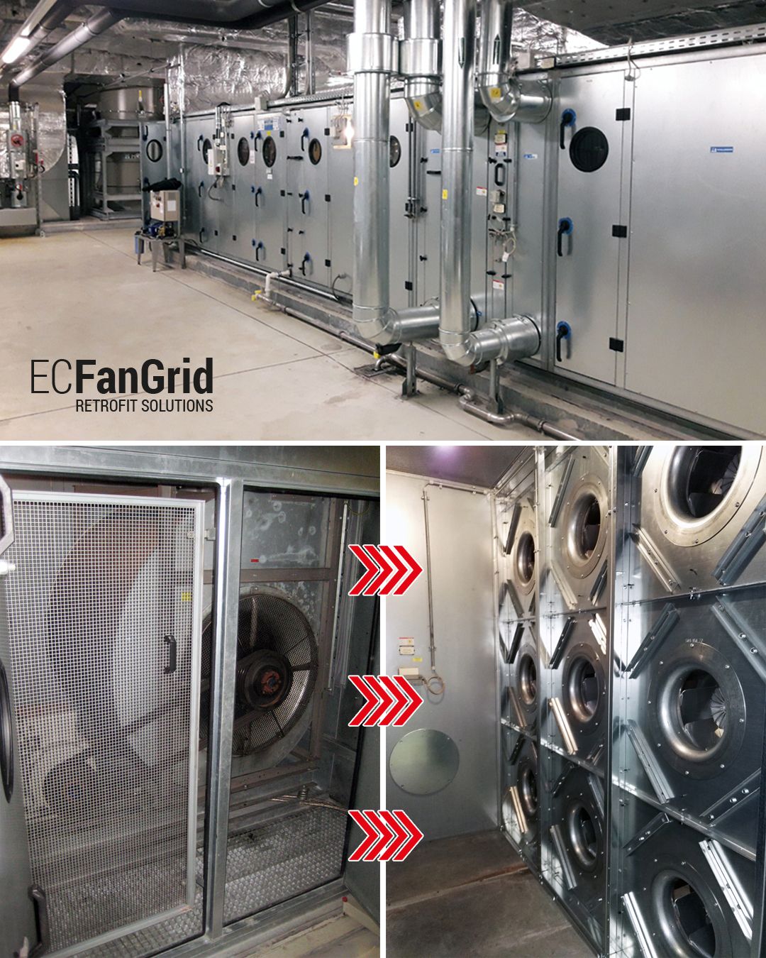 Un projecte retrofit consisteix en la modernització d’una unitat de tractament d’aire (UTA) en un edifici, substituint ventiladors tradicionals amb transmissió per corretja per diversos ventiladors EC PlugFan disposats en configuració de paret de ventiladors.