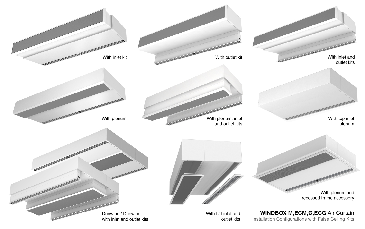Mitjançant la incorporació d'una sèrie d'equips, la cortina d'aire WINDBOX, disposa de fins a nou configuracions diferents d'instal·lació que juntament amb gran varietat de possibles acabats, la converteix en una cortina d'aire extremadament versàtil.