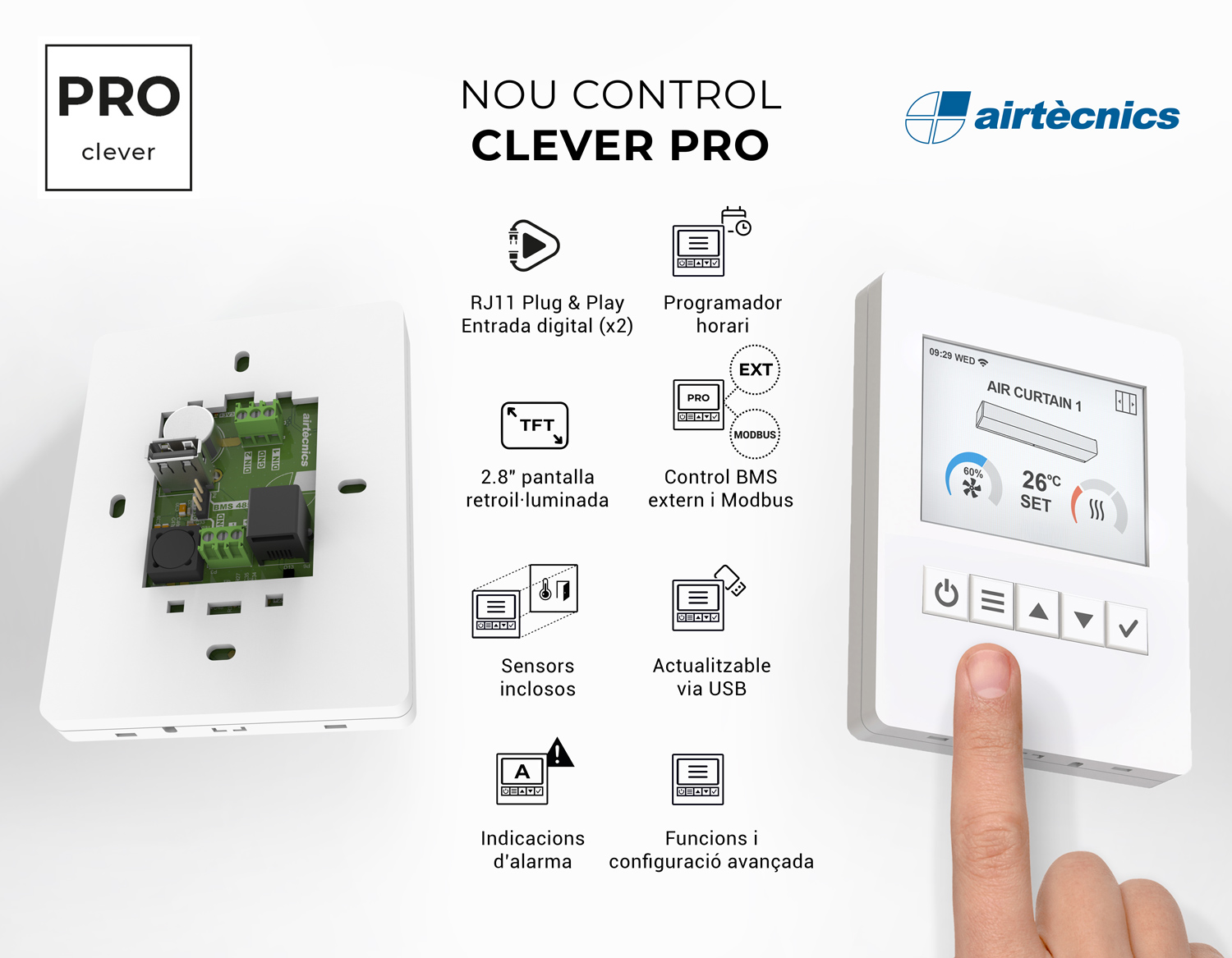 | Clever PRO Control universal intel·ligent, disponible sota petició específica, compatible amb cortines de dues i cinc velocitats, sense calefacció o amb calefacció d’aigua, elèctrica o per bomba de calor. |
