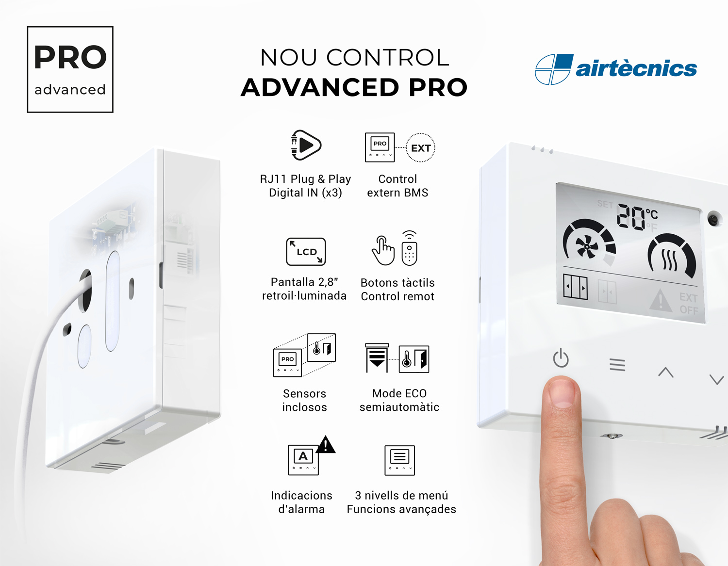 Advanced PRO Control amb funcionament semiautomàtic, connexió Plug & Play RJ11 i entrades digitals. Pantalla LCD retroil·luminada de 2,8” amb botons tàctils i comandament a distància IR. |