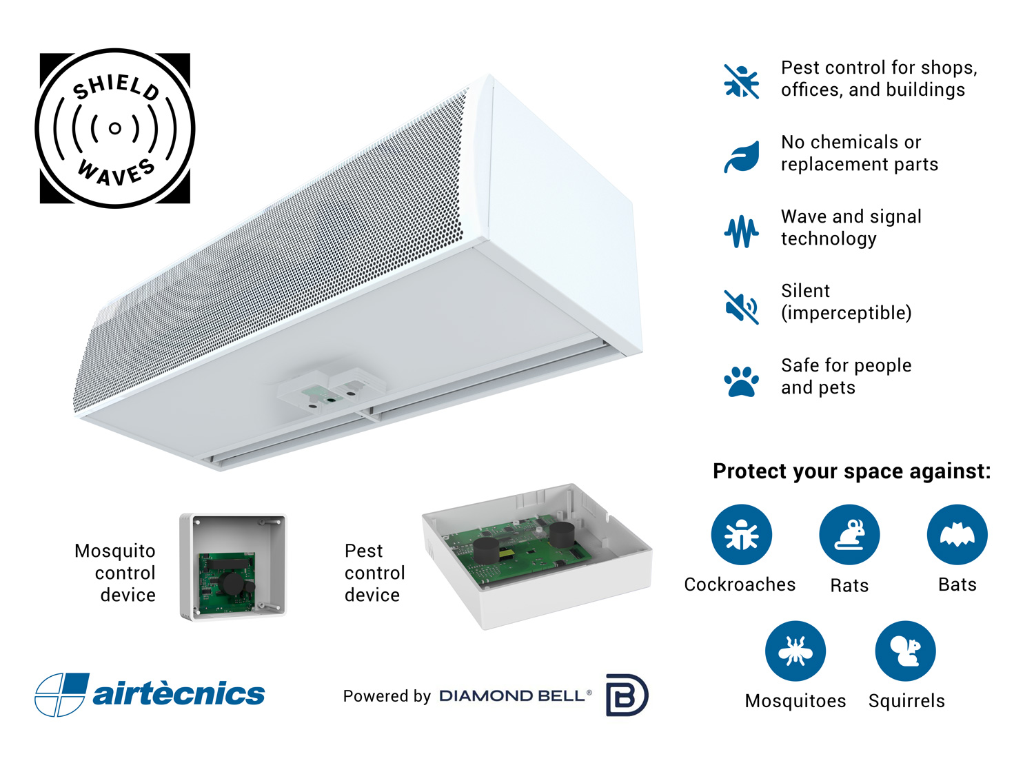 Shield Waves is integrated inside the air curtain casing. Its patented Clean Tone ultrasonic system operates without harmonics and emits stable signals. This feature ensures improved electromagnetic compatibility, lower energy consumption, and minimal interference with other devices.